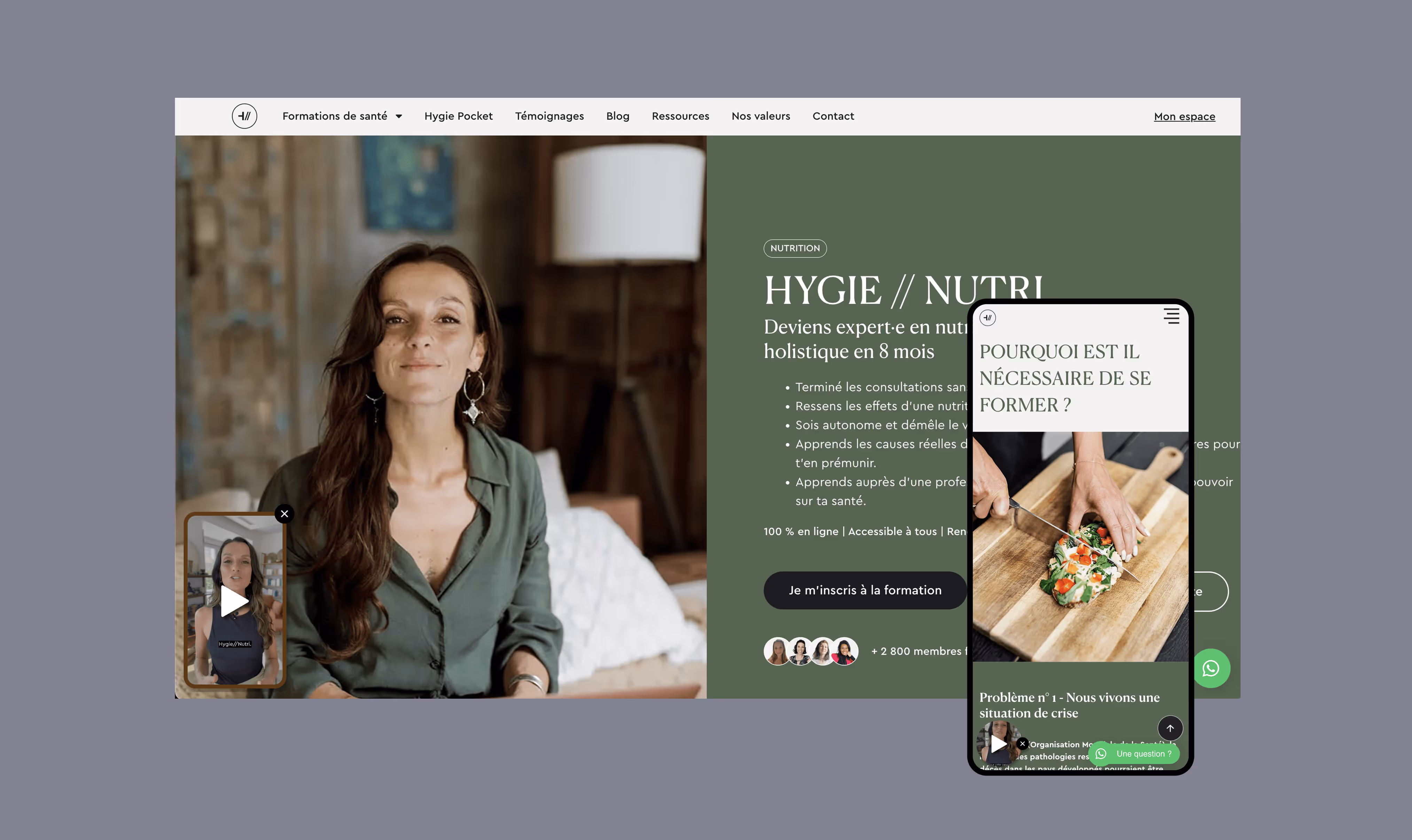 Le site a été pensé comme une véritable plateforme de formation, centrée sur la commercialisation de programmes dédiés à la nutrition, la naturopathie, la cuisine végétale ou encore les techniques de respiration. Chaque page de cours a été conçue comme un mini-écosystème autonome, intégrant un tunnel de vente personnalisé qui guide l’utilisateur de manière subtile et fluide, depuis la première accroche jusqu’à l’inscription finale. Le parcours mise sur une narration visuelle immersive, des explications pédagogiques claires, des preuves sociales bien intégrées et une mise en scène des bénéfices concrets de chaque formation.